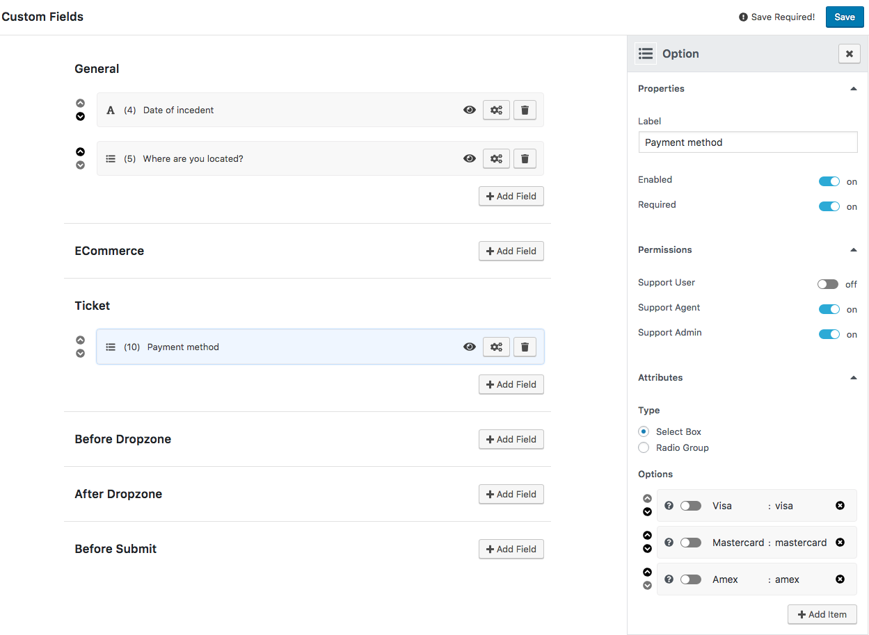 Customize the Ticket form with the Custom Fields add-on. Create your own fields, place them anywhere in the ticket, and decide who has access to viewing the data. We have created an excellent and easy to use interface, which allows you to create any type of form field, set permission by user role, select if it's a required field, add a label, placeholder and more!